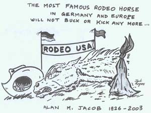 Wo er auch an zwei „ Spagetti Western“ mitarbeitete. Dort angekommen war der Dollar dramatisch gefallen, die Investoren hatte kalte Füße bekommen und wochenlanger Streit mit den Behörden um Genehmigungen im Hafen von Genua führten dazu, dass das Unternehmen einen problematischen Start hatte. Die ersten Vorstellungen im Sportpalast in Rom, dann in Turin und Zürich waren dennoch große Publikums Erfolge. In Frankreich schließlich war die Rodeo Gesellschaft zahlungsunfähig und alles wurde verkauft. Alan kommentierte das mit Galgenhumor: „I was ruined in Rouen.“ Aber Alan Jacob gab nicht auf, begann wieder einmal ganz von vorne und führte von da an über 30 Jahre lang die einzige Rodeo Show in Europa. Sie gastierte vorwiegend an den Standorten der Amerikanischen Armee. Jedes Wochenende an einem anderen Ort. Mit dem Rodeo wuchs das Interesse am Westernreiten und an den amerikanischen Pferderassen. Alan Jacob war ein großer Pferdekenner und er brachte zahlreiche gute Quarter Horses, Paint Horses und Appaloosas nach Deutschland. Seine Hengste prägten die Zucht in den 70er und 80er Jahren. Die Deutsche Quarter Horse Ass. berief ihn für seine Verdienste um die Rasse in die DQHA Hall of Fame. Eine Auszeichnung , auf die er sehr stolz war. Alan Jacobs war ein eigenwilliger Charakter mit einem intelligenten Humor und sehr viel Charme. Er war ein echtes Original, der in seinem Leben immer durch Höhen und tiefen gegangen ist. Mittelmaß war nie seine Sache. Sein letzter Hengst, der 24jährige „Andy Poco“ ein Foundation gezogener Quarter Horse Hengst hat ihn nun überlebt. PRL Oder
