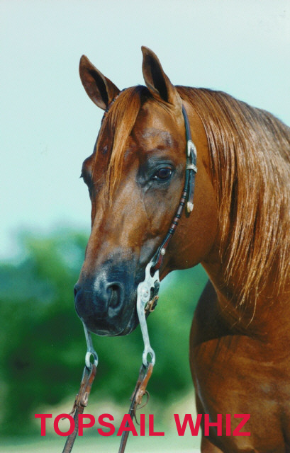 This has been an milestone year for this extraordinary stallion. Topsail Whiz was inducted into NRHA's Hall of Fame at the 2003 NRHA Convention in Las Vegas, Nev. The Hall of Fame represents not only NRHA's past, but its present and future. Topsail Whiz is an excellent representation of all three categories. He is a third generation Hall of Famer. His sire, Topsail Cody was inducted into the NRHA Hall of Fame in 1996. His grandsire, Joe Cody, was inducted in 1989. If you read the results in any current NRHA Reiner magazine, you will notice that Topsail Whiz is represented across the board - in everything from NRHA's entry-level classes to the prestigious Open divisions. At age sixteen, Topsail Whiz has produced an NRHA Open Division Futurity Champion as well as Futurity Intermediate and Non Pro Champions. He's sired two NRHA Derby Champions, two USET Champions, an NRBC Derby Champion, several Aged Event reserve champions, numerous NRHA Futurity finalists in every division, NRHA World Champions and top ten placers. He's sired several AQHA World Champions and at the 2002 AQHA World Show, the get of Topsail Whiz won world championship titles in the Amateur, Junior and Senior Reining - a clean sweep. And, as far as the future is concerned, many sons and daughters of Topsail Whiz are already on record as sires and producers of NRHA money earners.