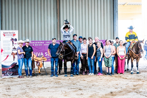 Auch die Open Reiter durften um eine tolle Trophy reiten, gesponsert von Win Baumert aus Luxembourg und zugleich Vorsitzender der NRHA Luxembourg. Win Baumert konnte die Trophy nach spannenden Ritten in dieser Klasse der glücklichen Reiterin Melanie Thönnes übergeben. Sie erritt mit Gota Lotta Cash eine 71 und befand sich zusammen mit Elias Ernst auf Royal Peekster BB, Score ebenfalls 71, auf dem ersten Platz. Zugunsten der Pferde wurde auf ein Stechen verzichtet, den Münzwurf entschied Melli für sich und konnte die Win Baumert Trophy mit nach Hause nehmen. Beide Sieger freuten sich zusätzlich über hochwertige Kopfstücke und ein entsprechendes Preisgeld!